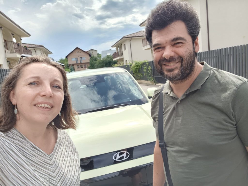 Suntem Paul și Ama, de foarte curând fericiții posesori ai unui Hyundai Inster yellow buttercream.