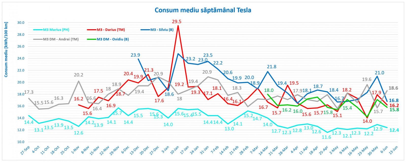 Pentru amatorii de statistici, am adăugat graficul consumurilor medii comunicate de echipa Tesla.