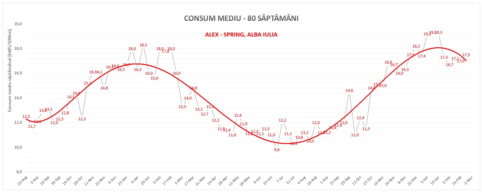 Consumul mediu săptămânal a variat după curba obișnuită, cu maxime în sezonul rece. Valori ceva mai ridicate în a doua iarnă ne-au determinat să ne întrebăm dacă au fost din cauza temperaturilor mai scăzute? Sau dacă Alex a fost mai grăbit?