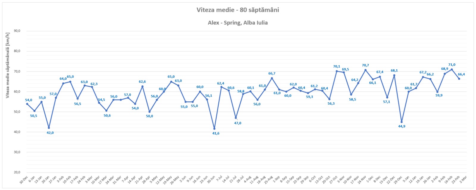 Graficul celor 80 de săptămâni clarifică faptul că în al doilea sezon rece viteza medie de deplasare a fost mai ridicată, cu o singura excepție. Comparând cu valorile transmise de colegii din alte echipe am ajuns însă la o concluzie surprinzătoare.