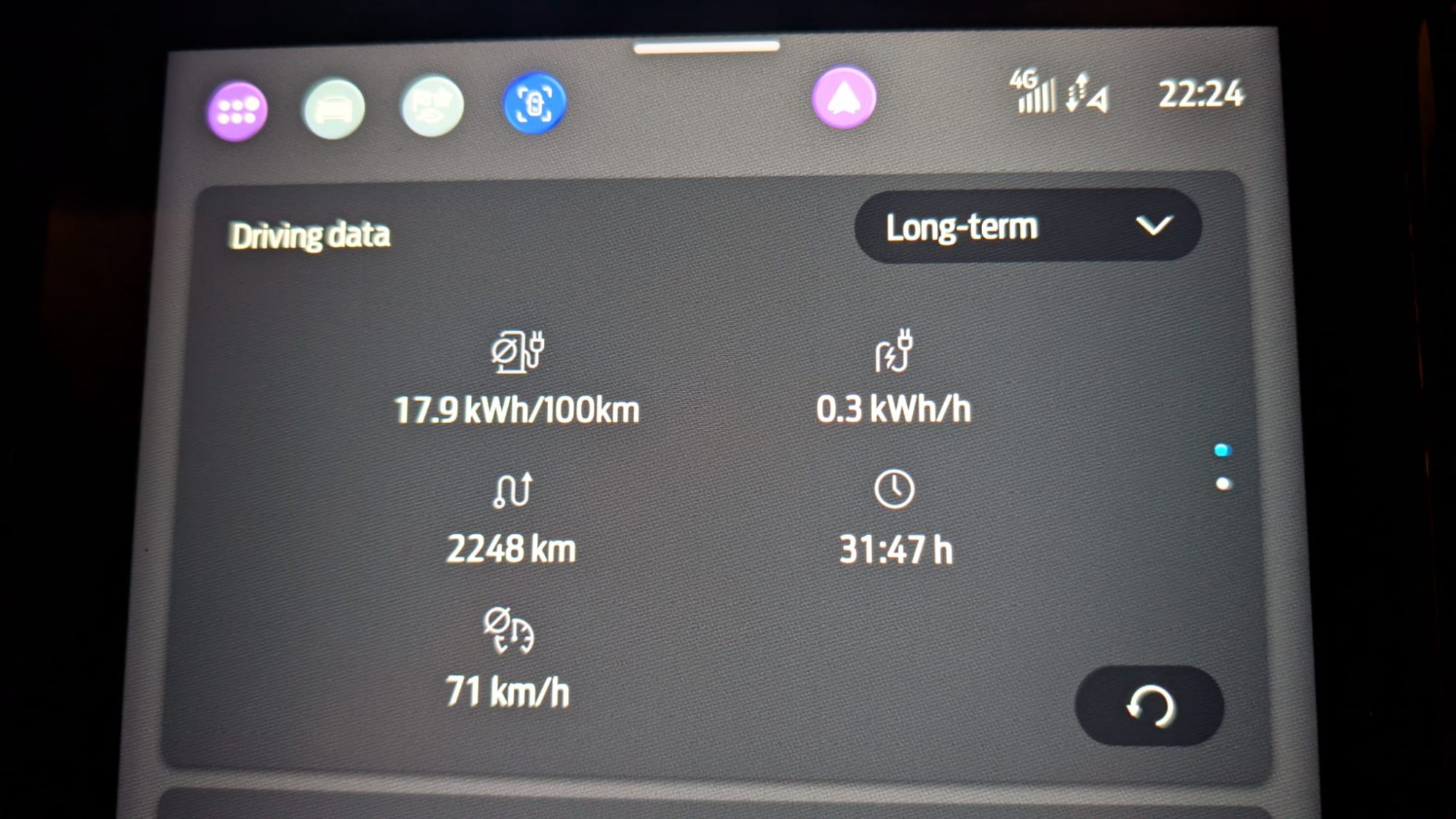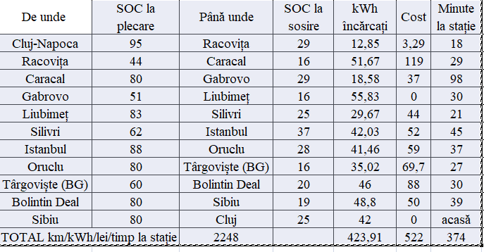 Am ajuns acasă la ora 22.15, așadar timpul pentru acest traseu a fost de 16 ore și 15 minute, din care aproximativ 45 de minute în vămi/pod, 2 ore și 13 minute la încărcarea efectivă, deci aproximativ 13 ore și 15 minute de deplasare efectivă, consumul, fiind de aproximativ 18,9 kWh/100 km.