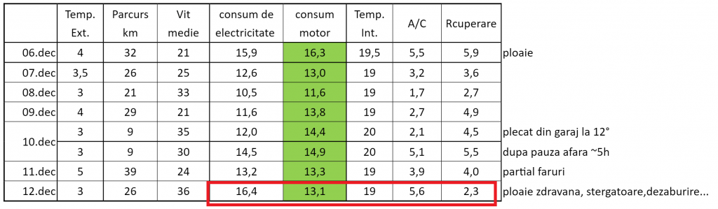 Cu ajutorul unor informații suplimentare comunicate de Wiwi, găsim unul din cei mai importanți factori, care au majorat destul de brusc consumul acestor modele. Deși în 12 decembrie temperatura exterioară nu a fost mai mică ca în alte zile, iar cea interioară nu a fost mai mare, distanța parcursă fiind cea obișnuită, cu o viteză medie ceva mai ridicată, consumul a atins cea mai mare valoare din întreaga săptămână. Din notițele adăugate de Wiwi știm că a plouat tare la Timișoara și că ștergătoarele și dezaburirea au fost utilizate intens.