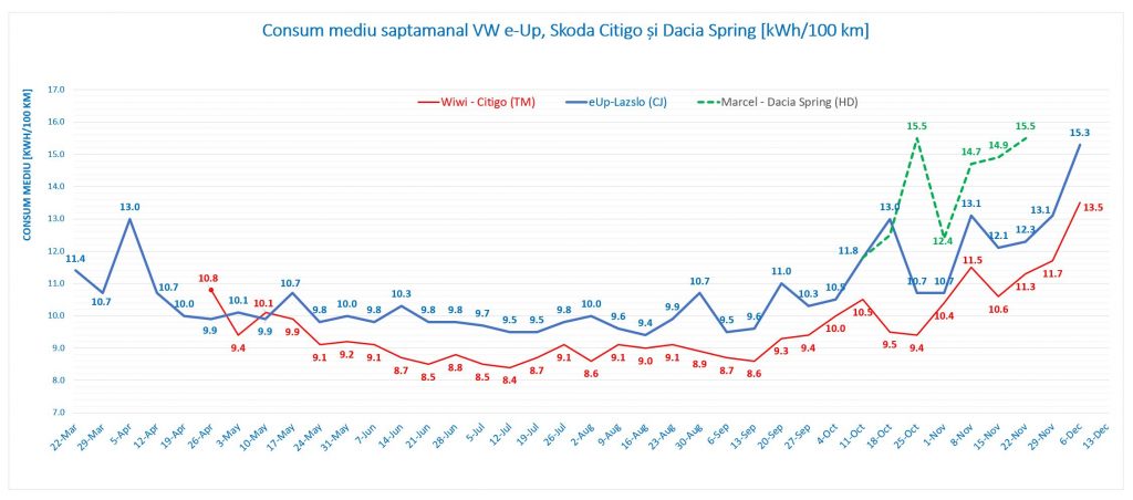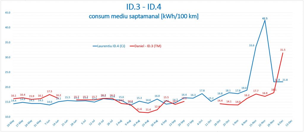 Analizând valorile realizate de Doina și Wiwi la Timisoara și Laszlo împreună cu soția la Cluj în ultimele șase săptămâni, ajungem la concluzia că ambele echipaje au înregistrat exact aceeași creștere a consumului mediu săptămânal cu 43%. Conducând în regiuni cu relief și temperaturi diferite, pare a fi doar o întâmplare majorarea procentuală identică a consumului?