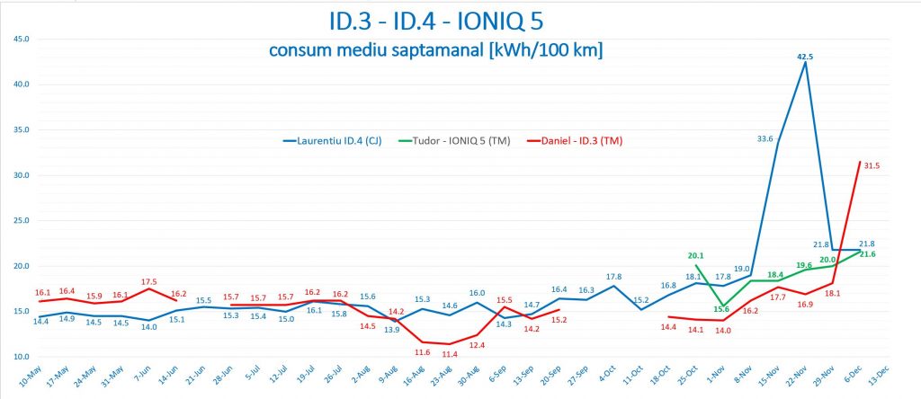 După valoarea foarte bună (15.6 kWh/100 km) realizată în raidul montan de aproape 2000 km, consumul IONIQ-ului a crescut treptat, deocamdată fără salturi mari înregistrate de colegii cu modele VW. Este mult prea devreme pentru orice concluzii, mai ales că Tudor semnalează câteva valori puțin plauzibile indicate la bord pentru săptămâna trecută, a căror cauză nu o cunoaștem încă. Suspiciunea că ar fi valori de consum pe coborâri, nu are motiv în Timișoara, unde singurele mini-pante sunt cele câteva pasaje din oraș.