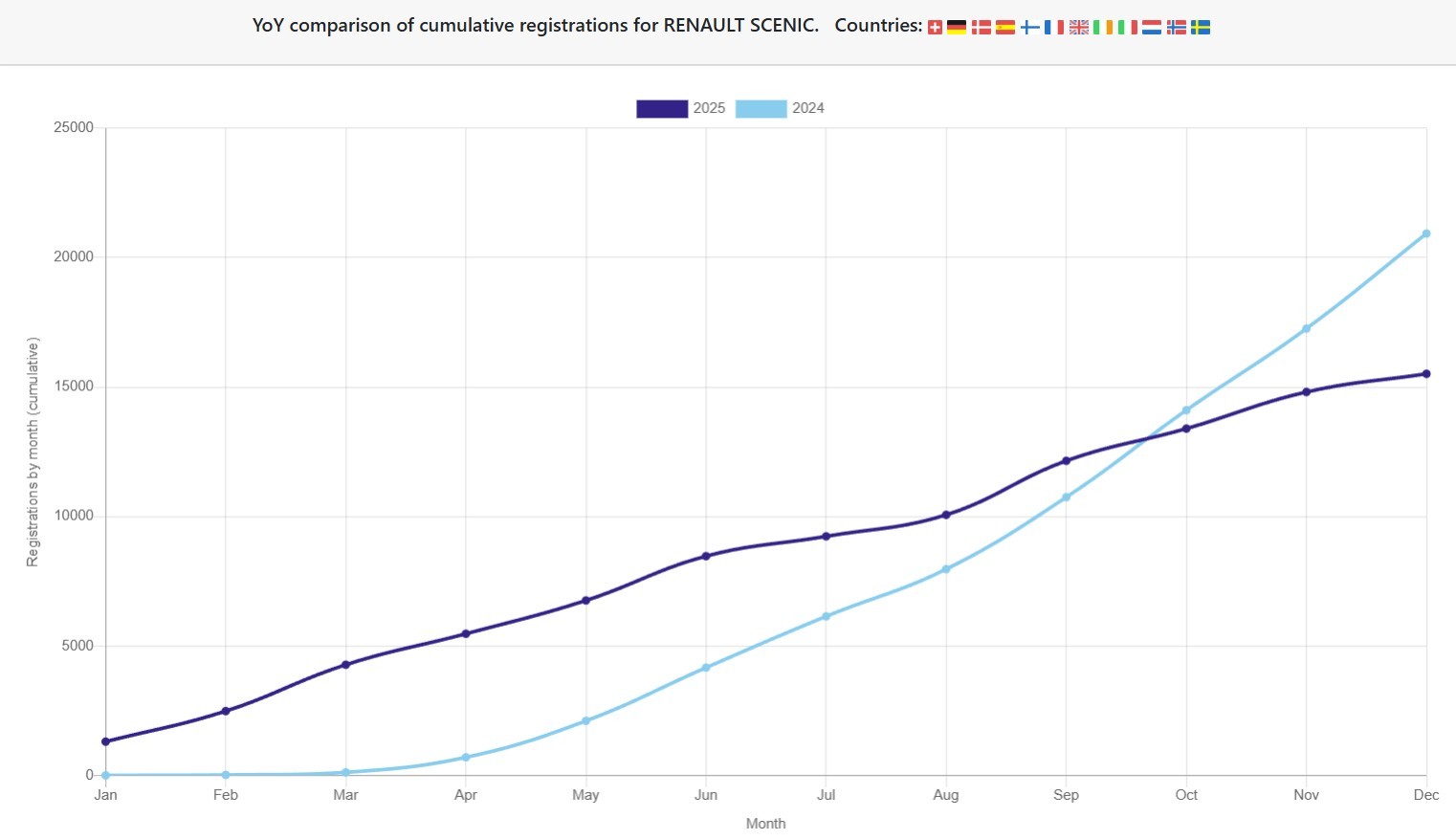 Renault Scenic, deși a pornit bine la drum în prima jumătate a anului, nu a mai ținut pasul începând din octombrie, totalizând in prezent 15.500 înmatriculări.