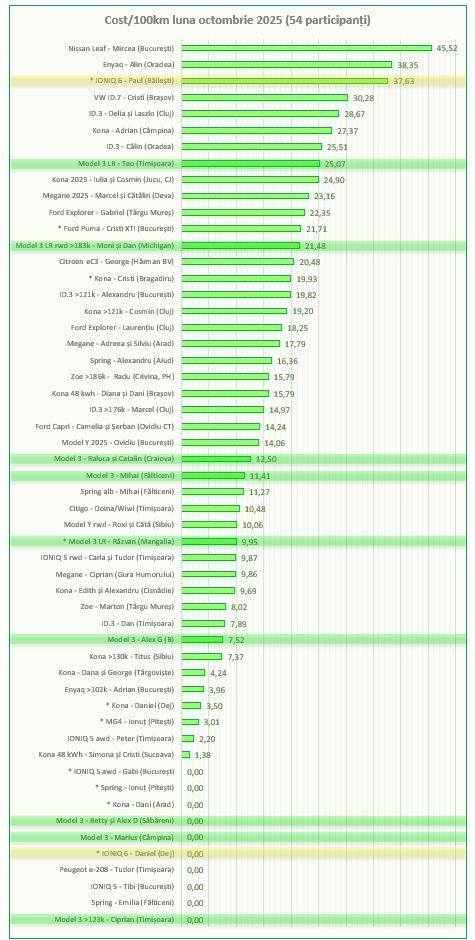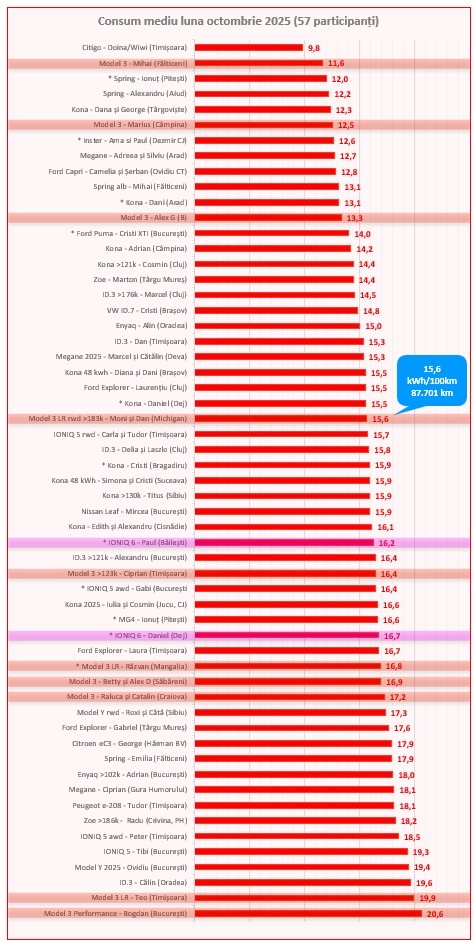 Cu oarecare invidie pozitivă, constatăm cum ID.7, cu experimentatul nostru coleg Cristi (Enyaq/Model YP/ID.7, Brasov) la volan, a realizat un consum mediu de 14,8 kWh/100km, mai bun decât IONIQ 6 și Model 3 LR în octombrie. Doar trei variante Tesla SR au coborât sub valoarea lui Cristi, în domeniul 11,6 – 13,3 kWh/100km (vezi Bilanț octombrie Model 3).