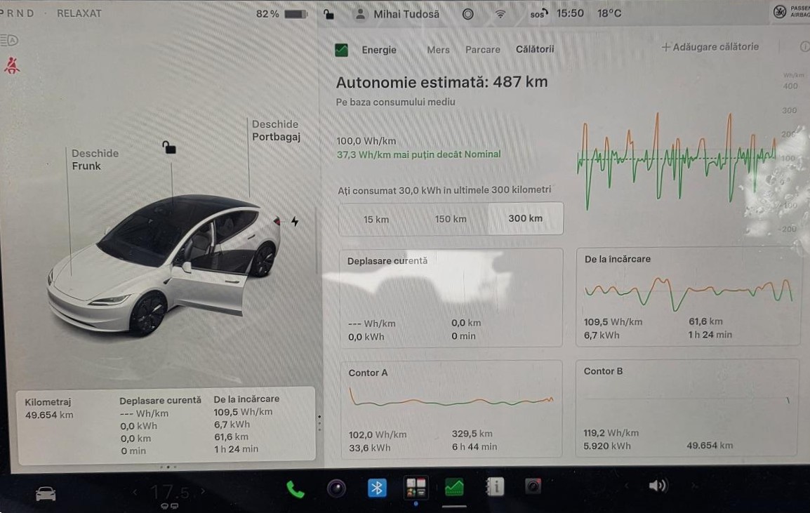 - Energie consumată în Park: 5.6 kWh (Precondiționare, Vehicul în așteptare, Ecran, Sentry, Update)