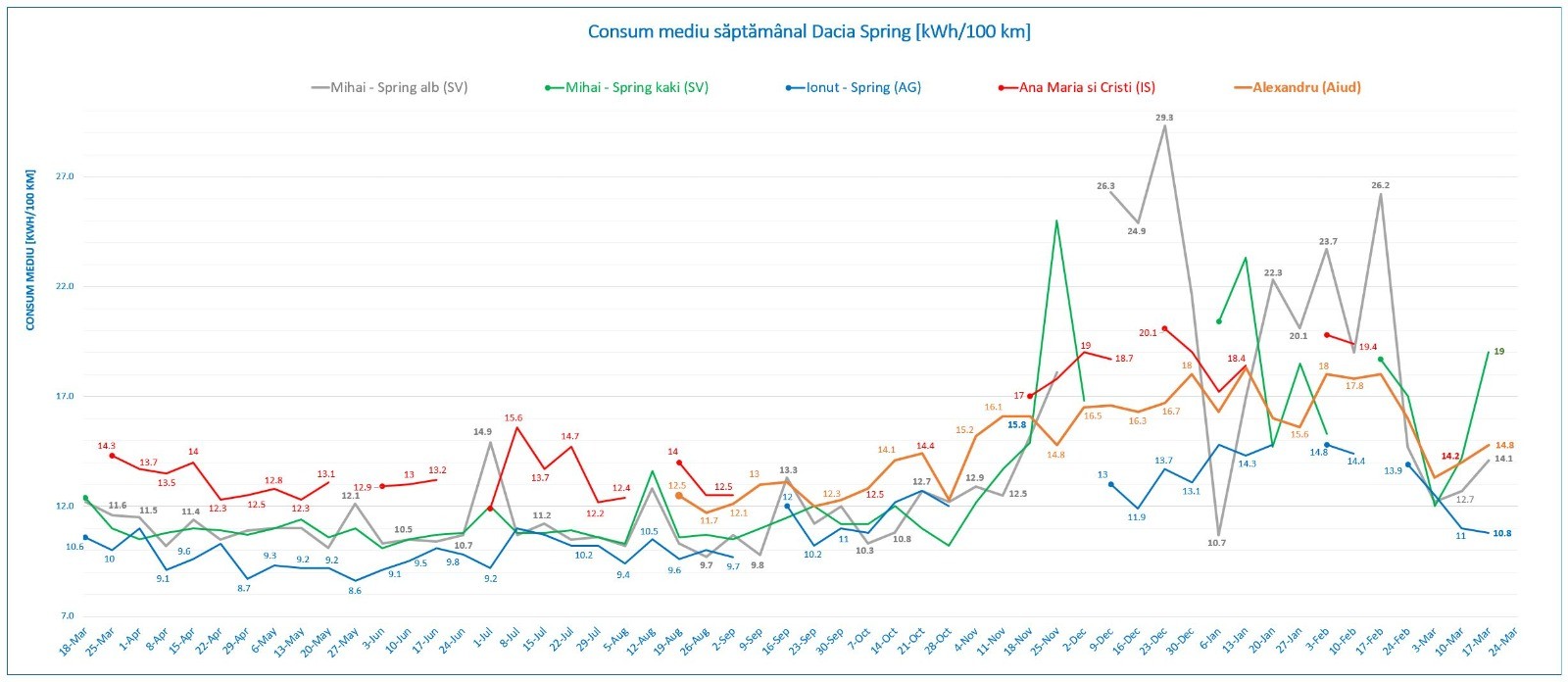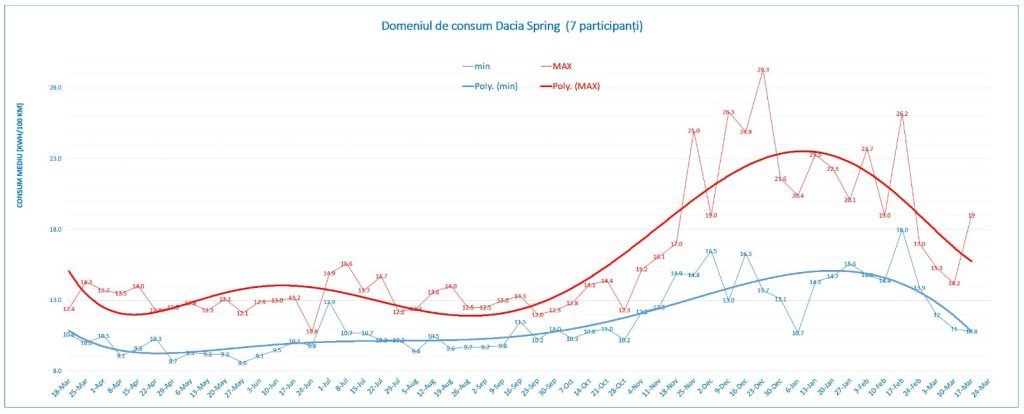 Săptămâna 17-23 martie a fost deosebit de interesantă din punct de vedere al producției sistemului fotovoltaic de 6 kWp, respectiv câte 35-36 kWh generați în fiecare zi. La fel și Spring-urile, au zburdat prin oraș sau prin afara lui cu diverse treburi circulând exclusiv cu kWh alimentați de la soare.