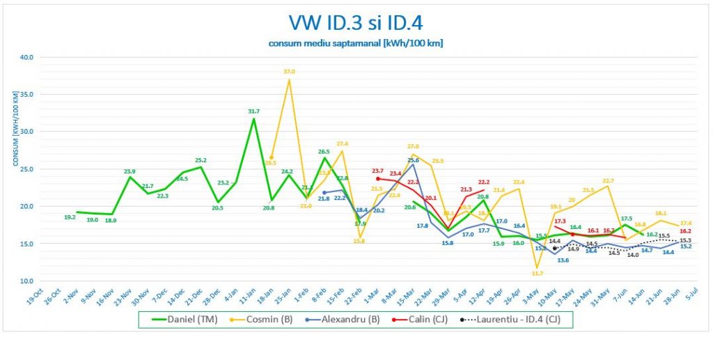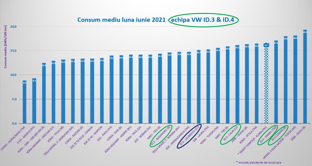 Față de media de consum realizată de toți participanții la proiectul Electromobilitate în luna iunie: 14.9 kWh/100 km, echipa VW se plasează în jumătatea superioară a valorilor, cu o surpriză plăcută din partea modelului ID.4 condus cu grijă de Laurențiu în zona Cluj, dar și cu două drumuri la București, despre care ne-a relatat în detaliu.