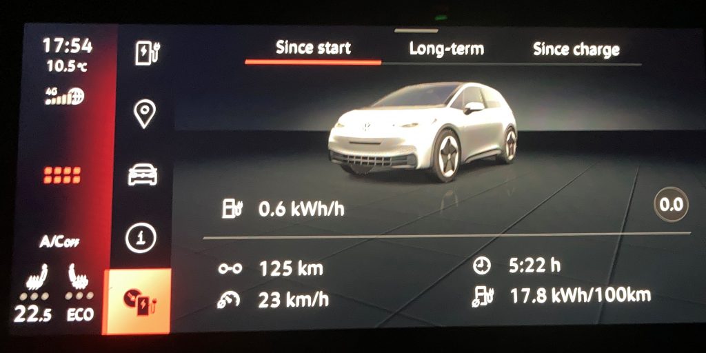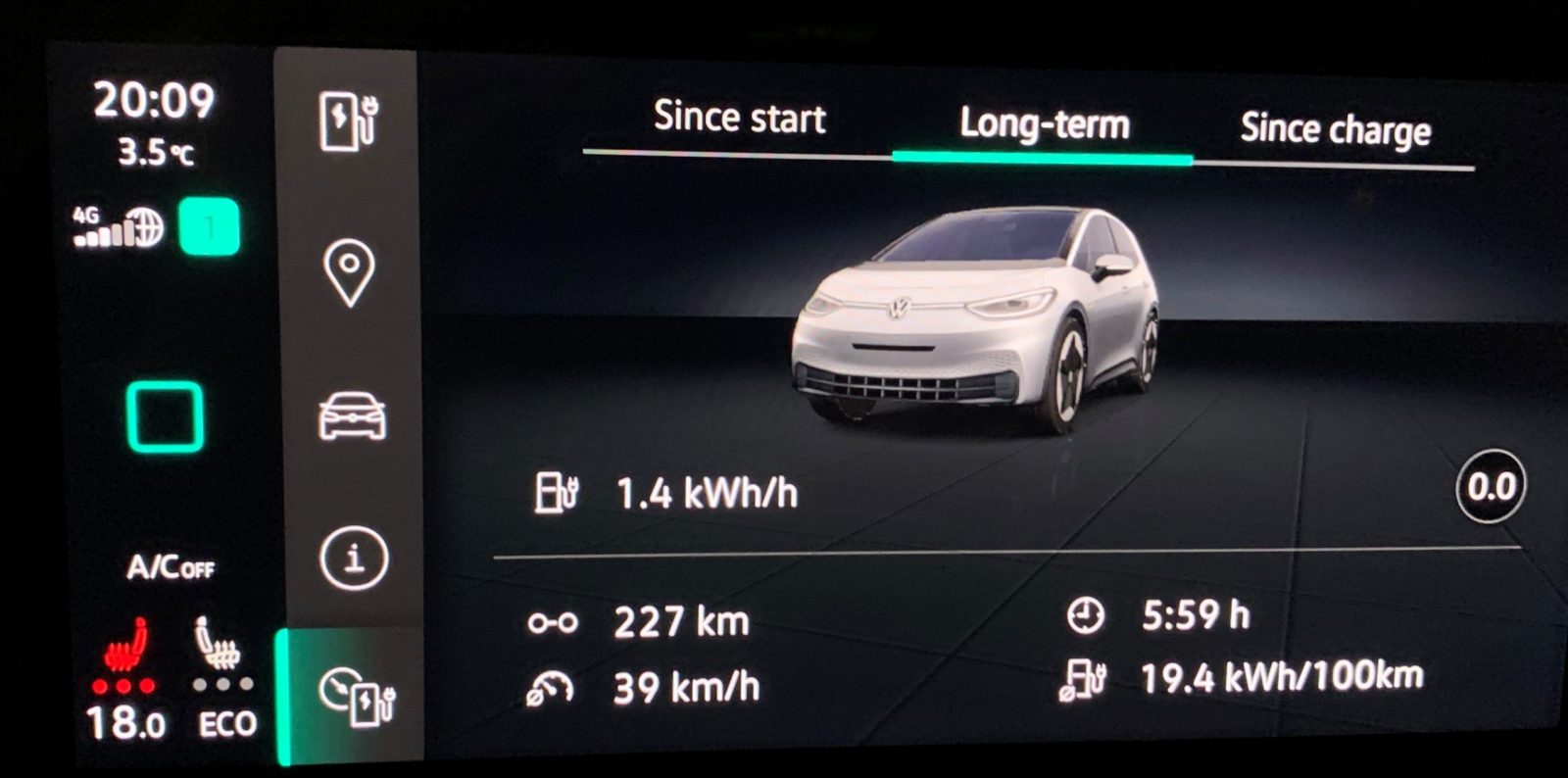Încălzirea habitaclului mai consumă încă 1-2 kWh, și dacă vrei să dezaburești/dezgheți parbrizul, te poți aștepta și la 10 kWh adăugați în plus la consum. După primele zile de rulat în oraș mașina a arătat un consum de 18.2 kWh/100 km. Acesta a scăzut după un drum de weekend în afara orașului, la temperaturi mai blânde.