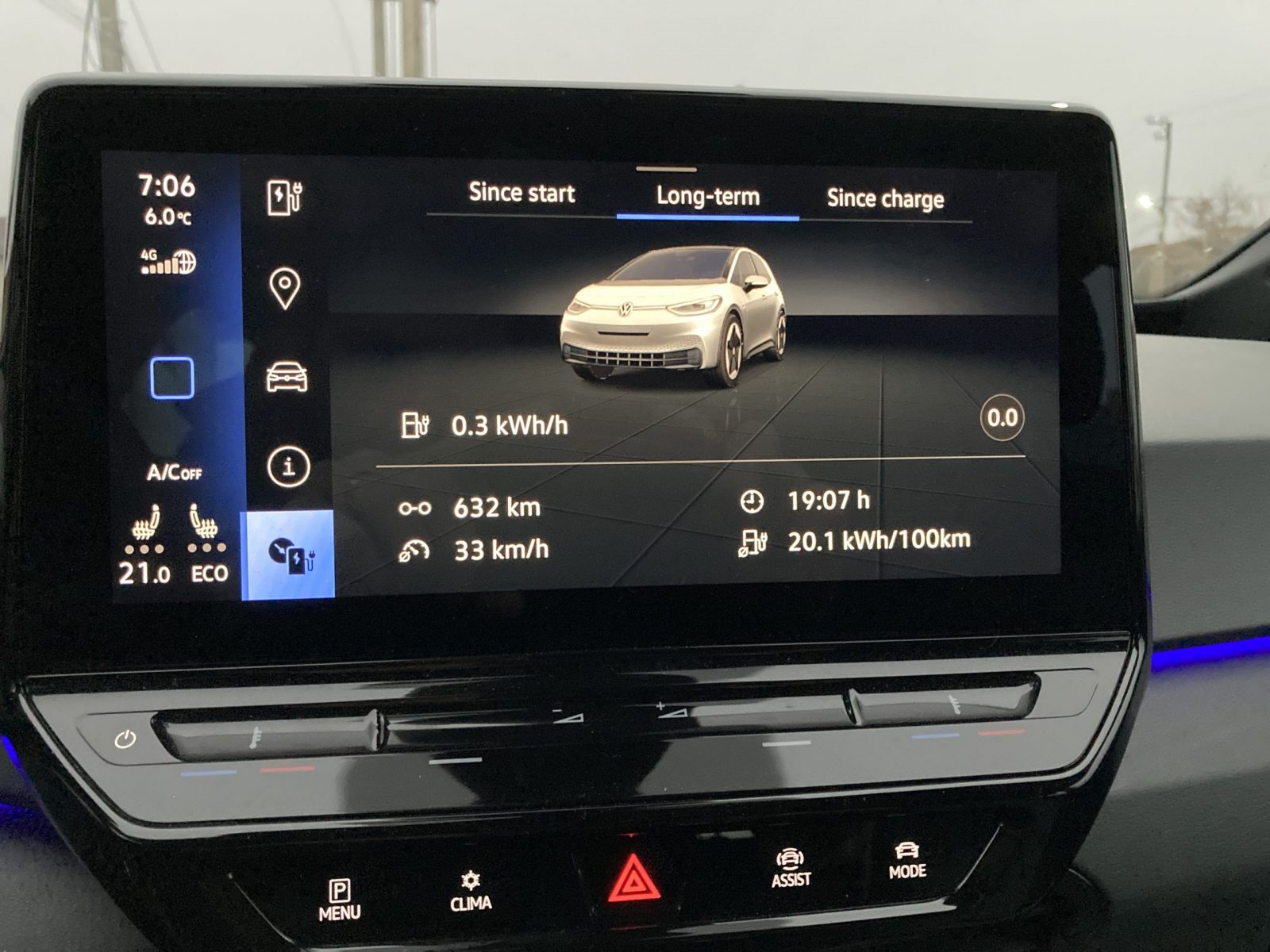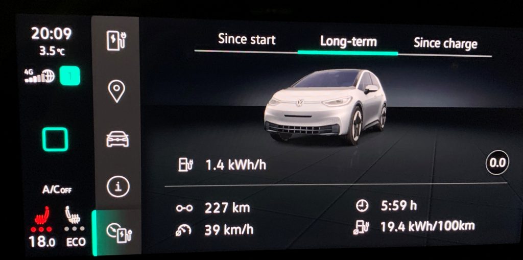 După cum știm din prima iarnă cu ID.3, la temperaturi ce scad sub 7-8 grade Celsius, ID-ul va încălzi bateria și va folosi o cantitate considerabilă de energie pentru acest lucru, în medie 7-8 kWh fiind adăugați la consum. Cu cât este mai frig afara, cu atât perioada de încălzire va fi mai lungă. Acest consum se poate observa la semafoare, când mașina staționează și nu sunt alți consumatori porniți. Când bateria a terminat încălzirea, se va auzi un zgomot relativ puternic de sub mașină, același care îl auzim și la pornirea încărcării.