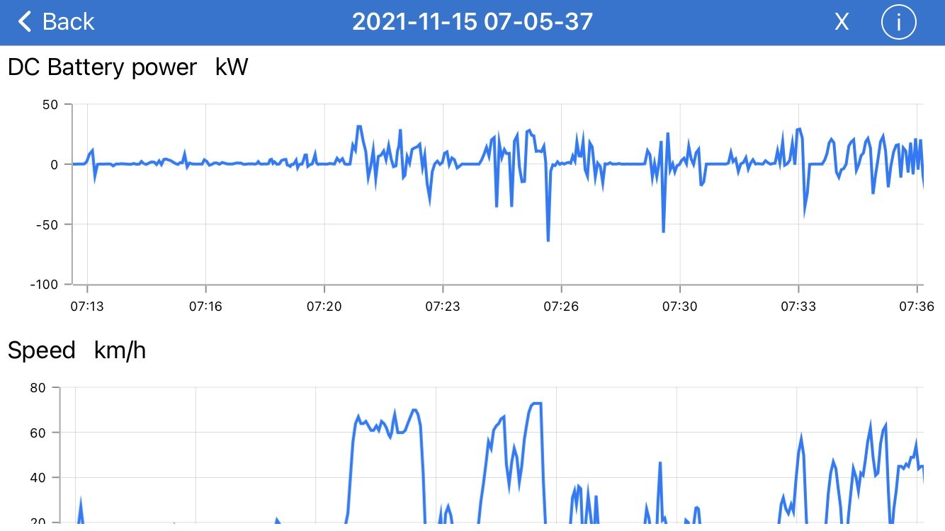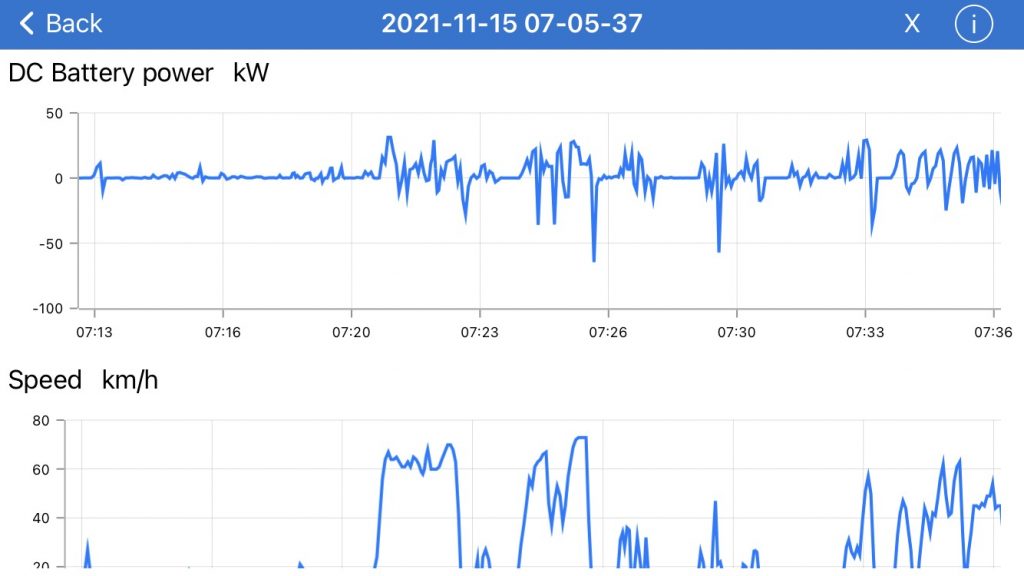 Consumul: 13.3 kWh/100km în cei 14 km de navetă, fără căldură pornită (pentru că încălzisem înainte). Adică 1.8 kWh consumați pentru deplasare. Am tras cu putere de maximum 40 kW din baterie la acest drum, dar nu a fost deloc senzație de mers leneș pe cât sugerează cifrele. La plecarea de la semafor eram mereu în ton cu restul, iar la viteză constantă foloseam sub 20 kW putere, după cum se vede în graficul atașat.