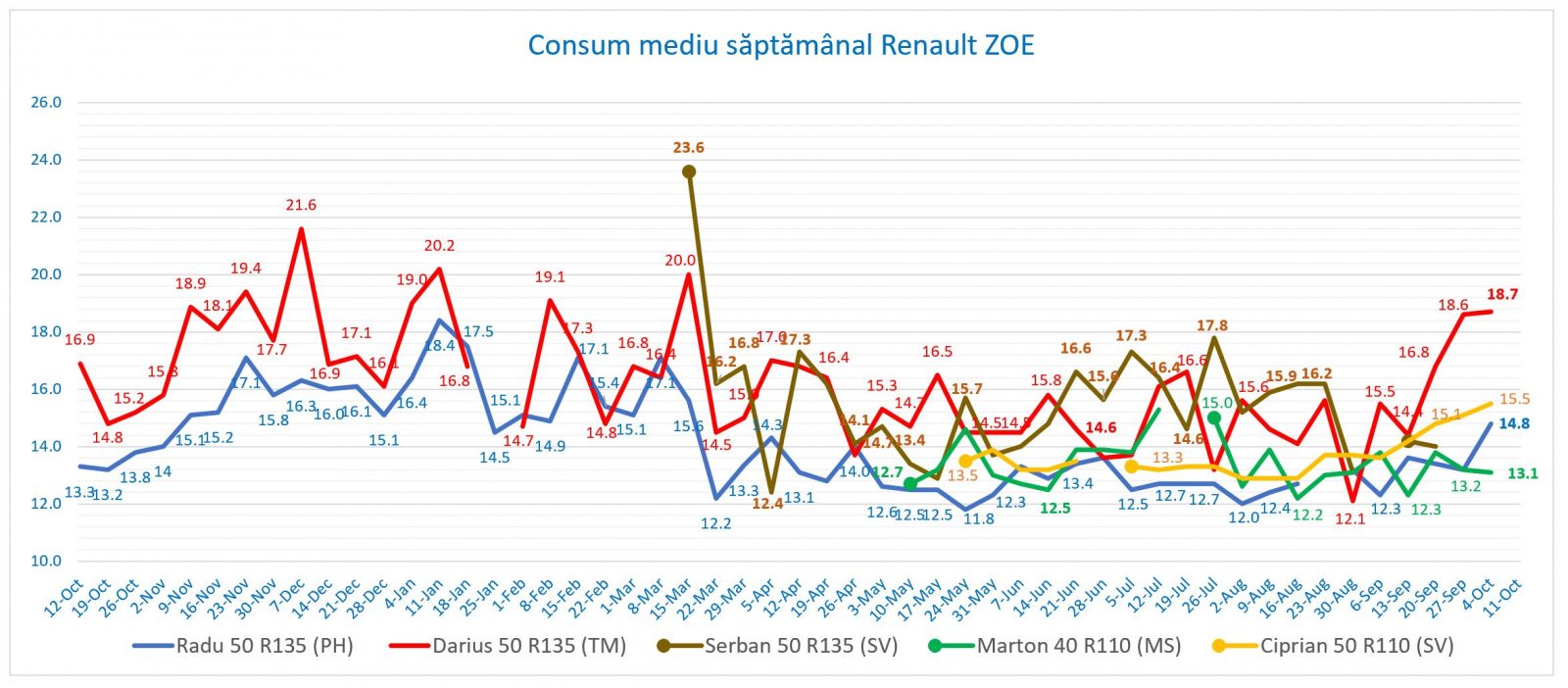 Pentru amatorii de statistici, evoluția consumului mediu săptămânal pentru echipa ZOE confirmă începerea sezonului rece, trei din patru valori fiind în creștere, când autonomia între două încărcări scade considerabil.