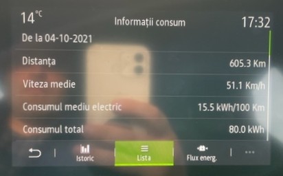 Pe traseul de la Păltiniș consumul raportat de Zoe a fost de 12.9 kWh/100, însă acesta e minimul posibil afișat de Zoe după update-ul de BMS. Consumul calculat de mine a fost de 14 kWh/100 km – din procentele consumate.