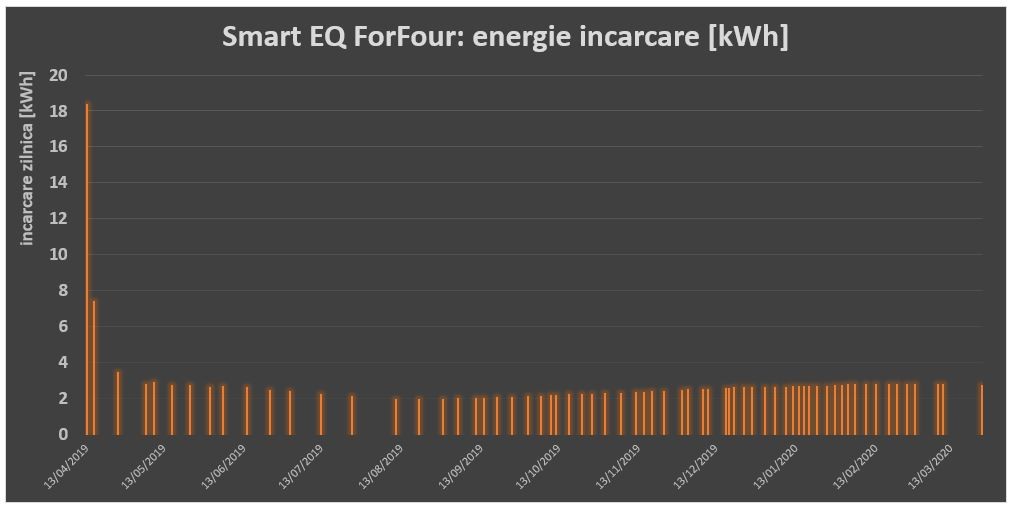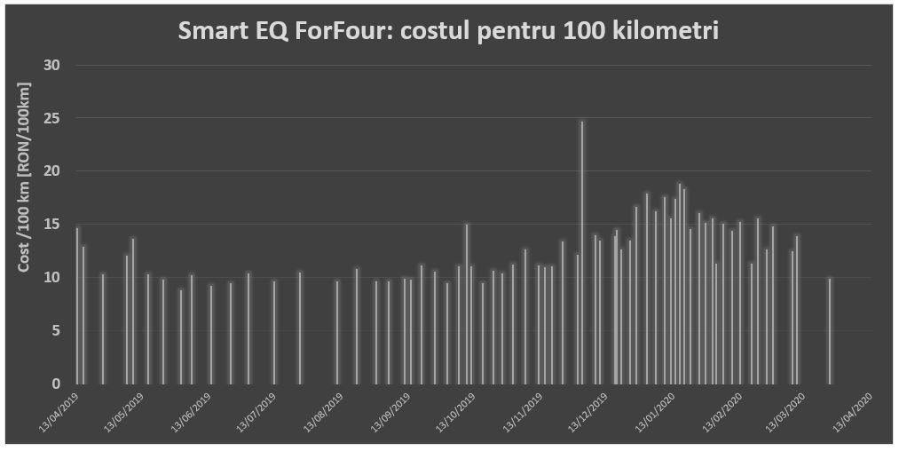 Cu o singura exceptie in 2 decembrie 2019, consumul Smart-ului se mentine in jur de 10 RON pentru 100 de kilometri in sezonul cald, urcand spre 18 RON in sezonul rece, asa cum am observat la toate masinile electrice utilizate in cadrul proiectului Electromobilitate.