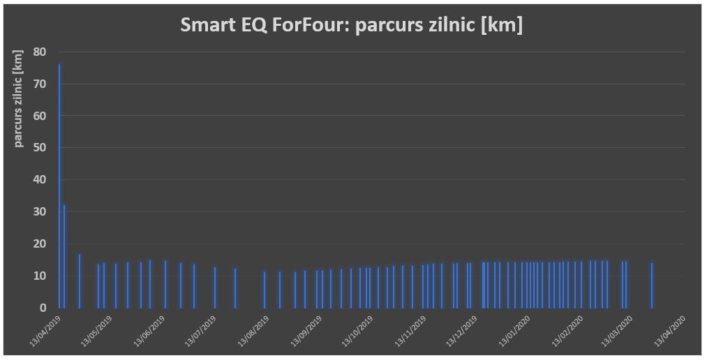 Din informatiile transmise am reprezentat grafic parcursul zilnic care este cuprins intre 10 si 20 km, cu exceptia primelor zile cand „familia electrica” a zburdat pe distante mai lungi cu noul Smart ForFour.