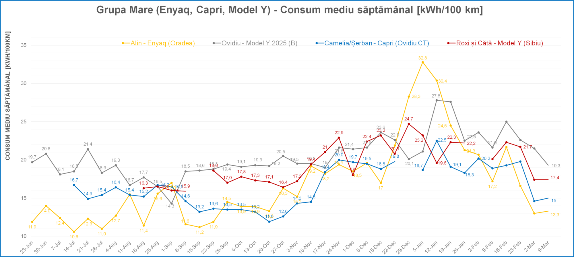 Așa a arătat săptămâna trecută pentru noi. Se vede clar că s-a îmbunătățit vremea, și este mai cald. Am scăzut la un consum de 17, de la 22-33 cât am avut în ultimele luni friguroase.
