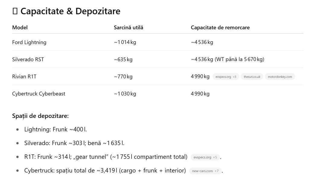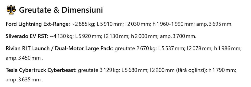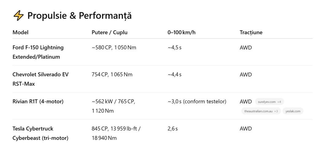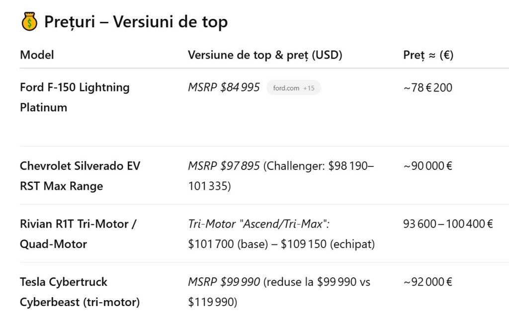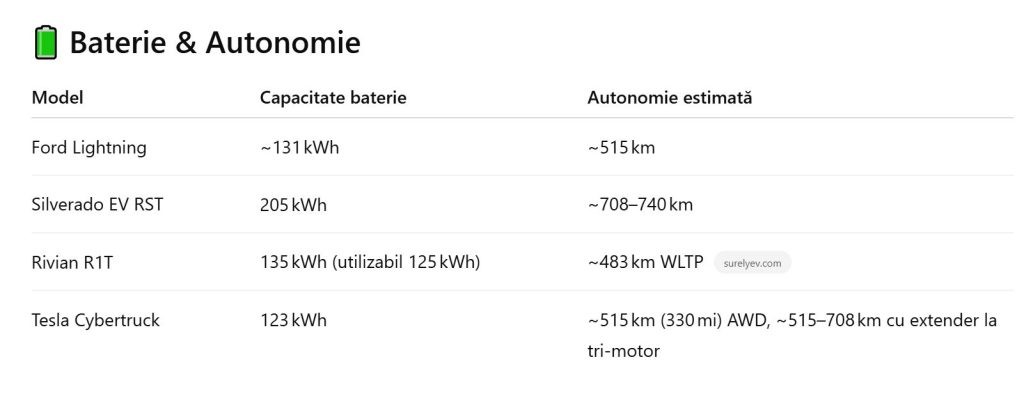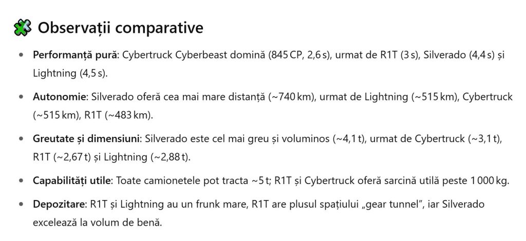 În ce măsură au reușit să prindă din mers tranziția spre electrificare, mai ales în acest domeniu cu clienți conservatori, rămâne de văzut. Pentru a înțelege mai bine unde se poziționează Ford Lightning și Chevy Silverado, în variantele de top disponibile în prezent, am compilat cu ajutorul Chat GPT o comparație a celor patru modele pe care le-am condus în diferite ocazii.