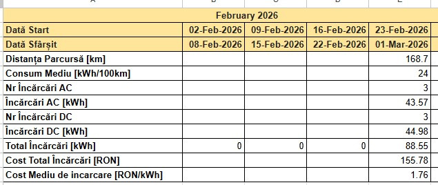 Încărcările au fost mai numeroase decât în mod normal, majoritatea făcute din dorința de a testa diferite scenarii. Am activat funcția Autocharge de la Eldrive și am fost curios să văd cum arată curba de încărcare la temperaturi apropiate de 0°C. A existat și o încărcare AC de aproximativ 3 ore, făcută mai degrabă dintr-o nevoie practică: aveam treabă în zona Parcului Cișmigiu, iar toate locurile de parcare publice erau ocupate, fie de mașini, fie de zăpada rămasă din ultima perioadă. Intru în prima săptămână din martie cu un SoC de 90%, pregătit pentru drumurile obișnuite prin oraș și pentru noi teste cu Hyundai Kona.