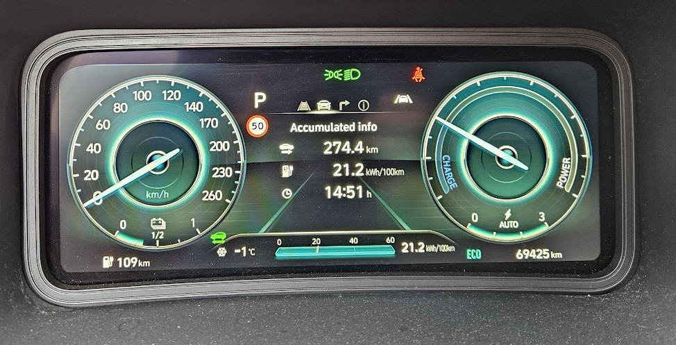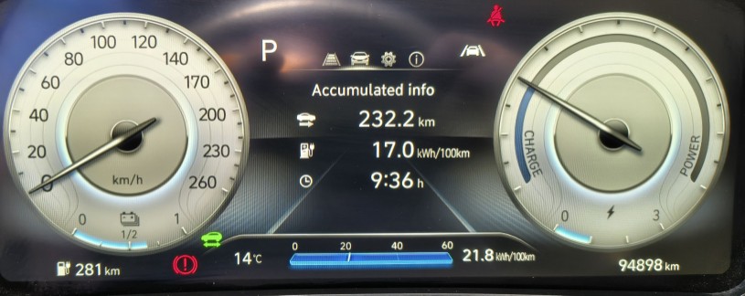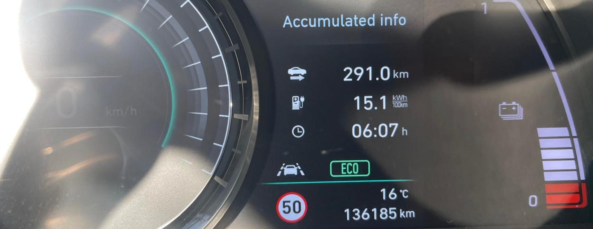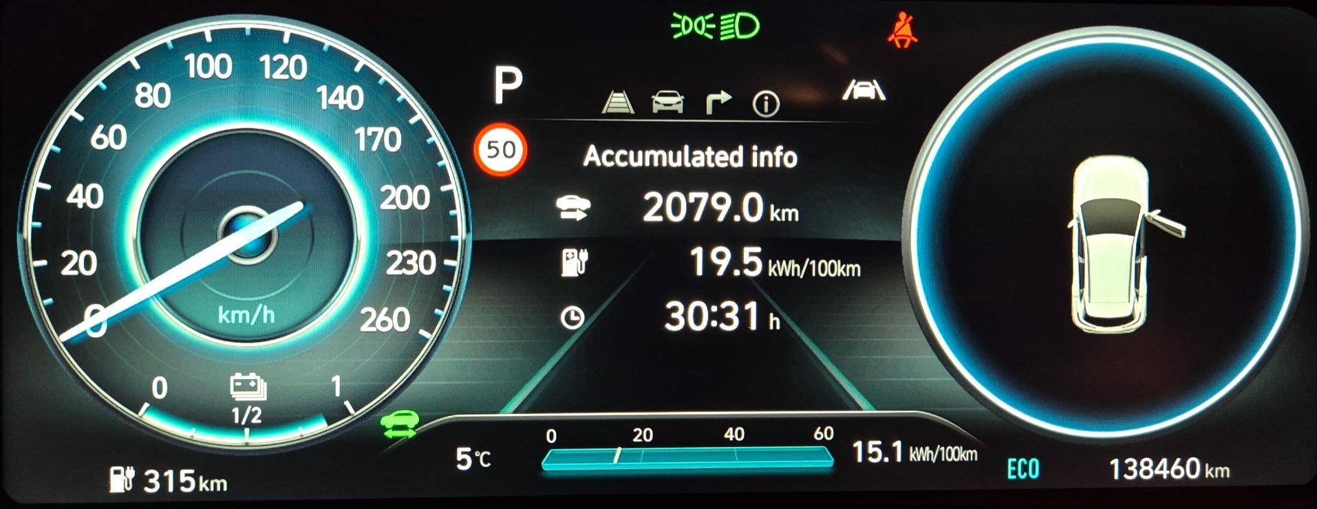 Între timp, s-au adăugat 1.224,4 km, ajungând la un total de 2.079,0 km, cu un consum mediu general de 19,5 kWh/100 km și 30 h 31 min de condus.