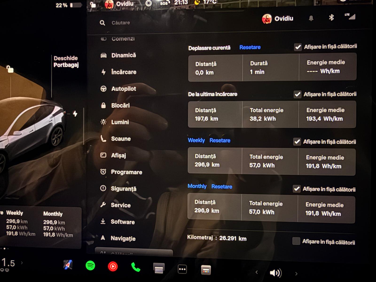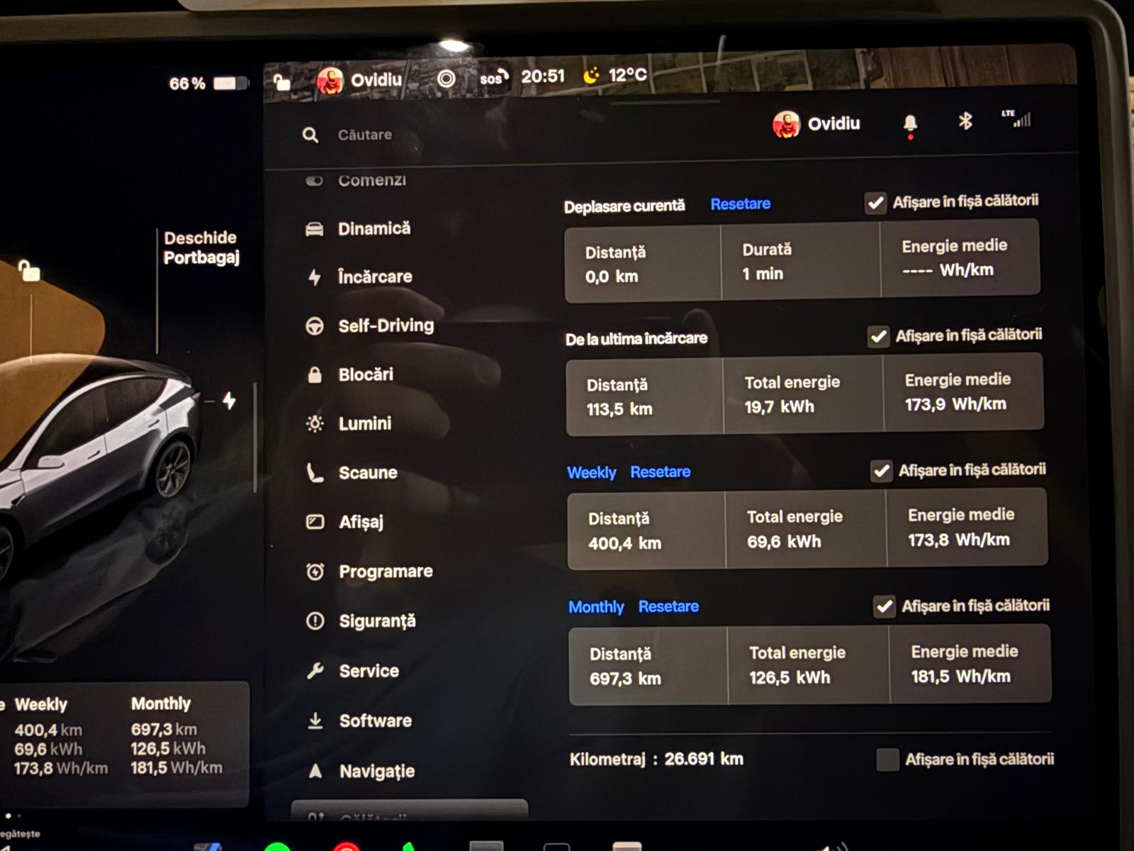 Drumuri doar prin oraș cu o viteză medie de 20 km/h și 15 ore petrecute la volan conform TeslaMate.