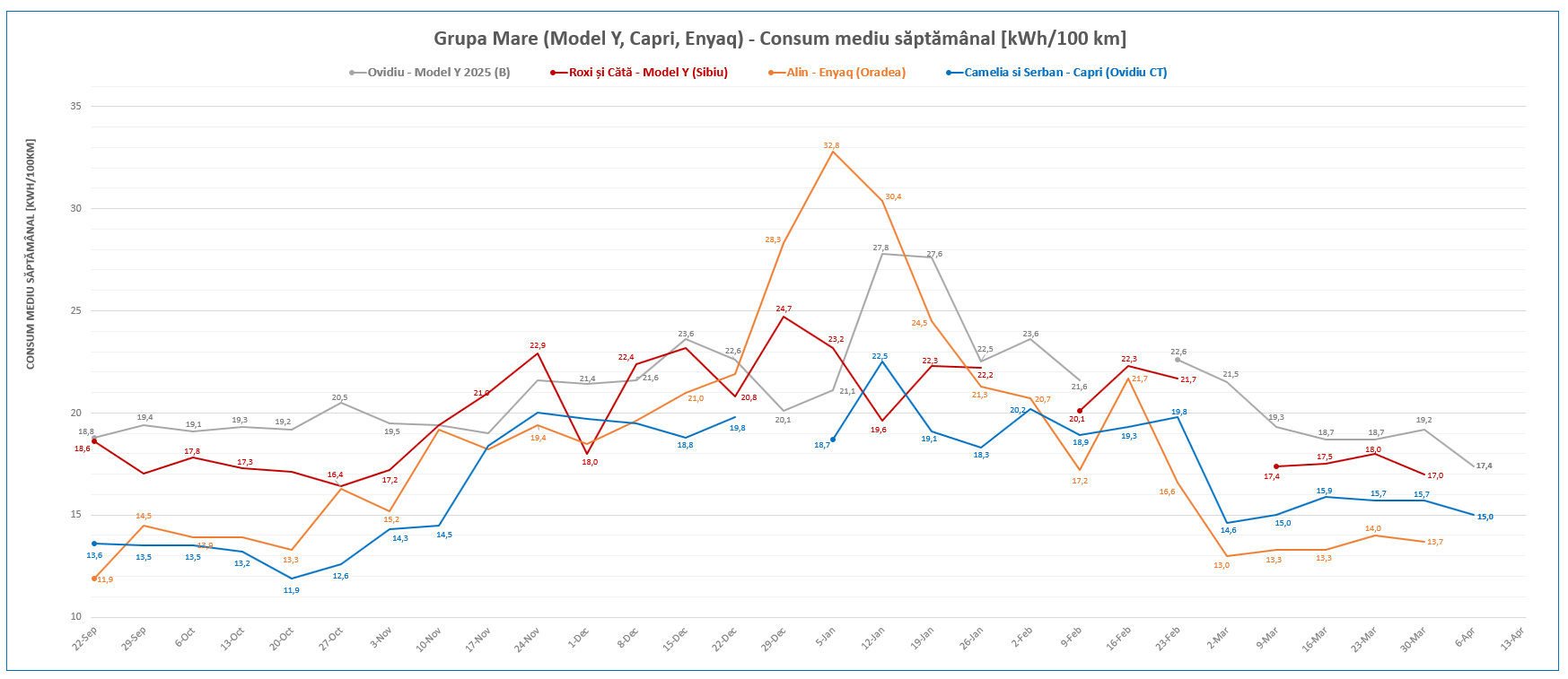 2. Pentru intervalul 6-12 aprilie avem 400,4 km parcurși cu 69,6kWh consumați în total și o medie de 17,4kWh/100km.