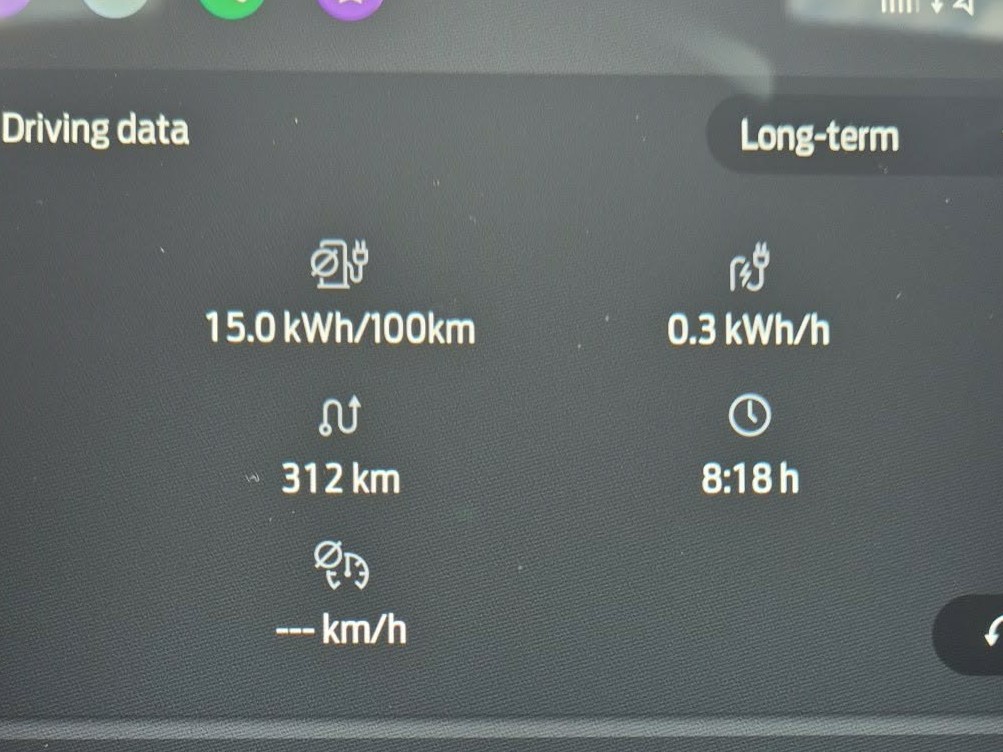 Din aceștia 150 au fost făcuți într-o vizită la țară, care cuprinde 30 km autostradă și restul DN, media vitezei fiind 45 km/h. Consumul mediu afișat la sfârșitul săptămânii este de 15 kWh/100 km.