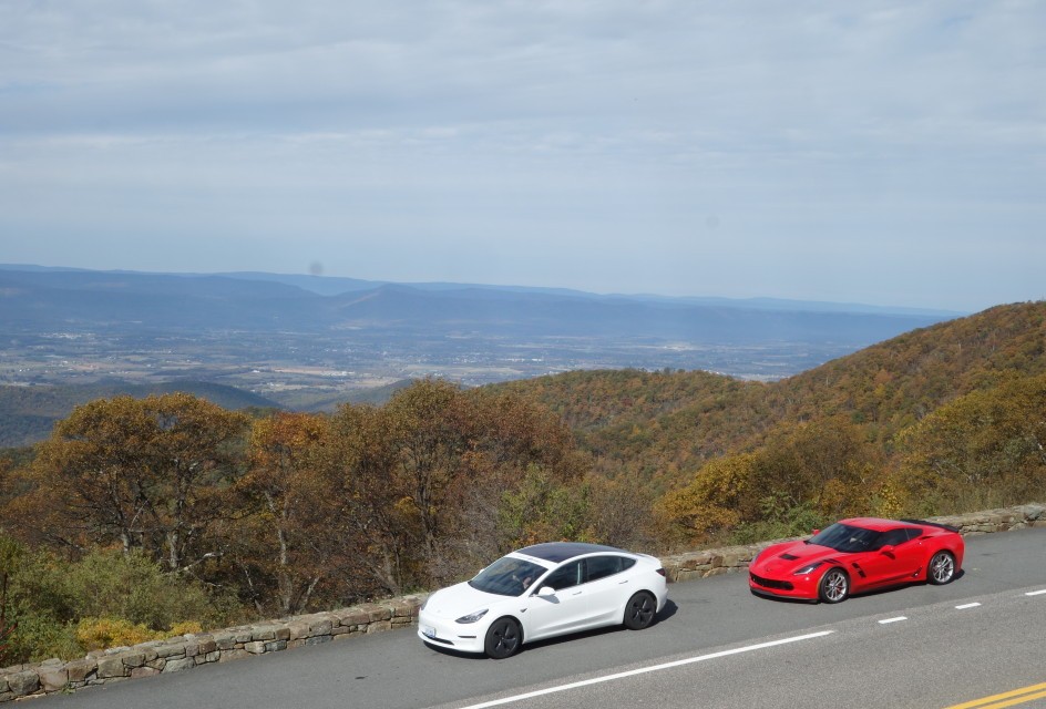 NOTA: impresiile de calatorie cu Corvette si Model 3 au fost culese pe cei 170 de kilometri ai unui drum croit in anii ’30 pe creasta muntilor Appalachi, denumit „Sky Drive” in Parcul National Shenandoah din Virginia, cu limite de viteza intre 40 km/h si 65 km/h.