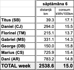 O săptămână de primăvară. Se vede impactul în consumul raportat de colegi. 15 kWh/100km este media ponderată pentru săptămâna #6.
