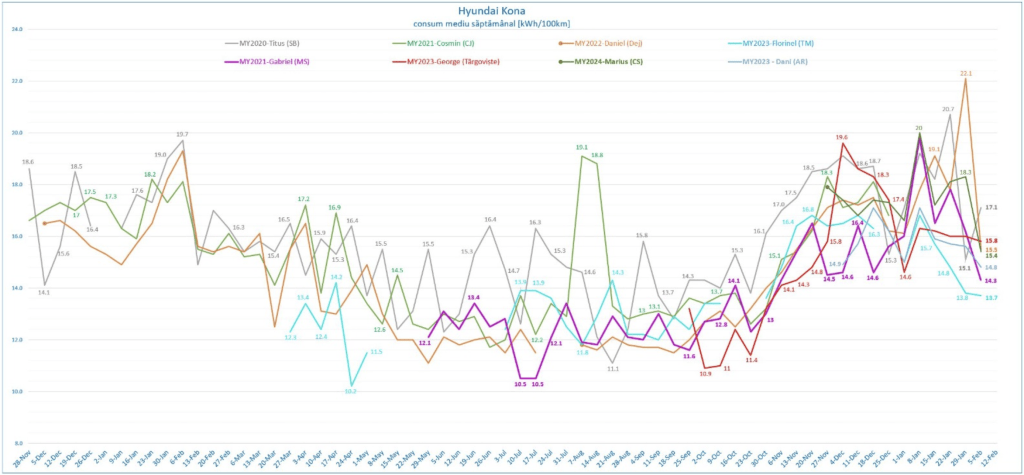 Astfel, consumul konițelor se vede în graficul consumului mediu săptămânal. Majoritatea colegilor sunt grupați în jurul valorilor de 14-15 kWh/100km. Anul trecut săptămâna #6 se prezenta cu 18.3 kWh/100km și o medie de temperatură de -1°C.