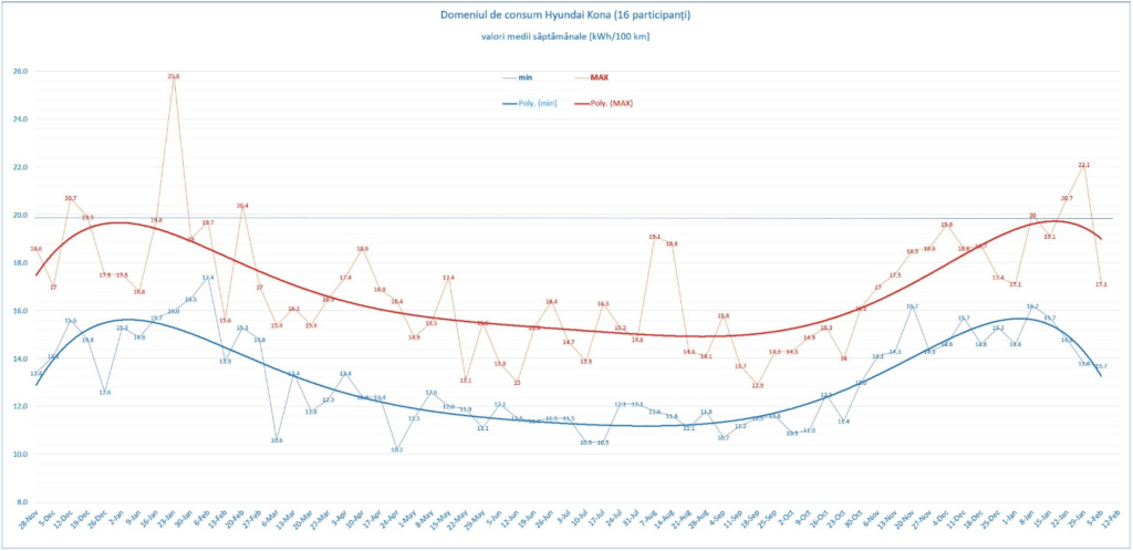 Valoarea de 22.1 kWh/100km a fost o întâmplare, drumurile scurte spunându-și amprenta pe graficul domeniului de consum de săptămâna trecută. Revenim la normal în săptămâna #6 de raportare, după cum se vede.