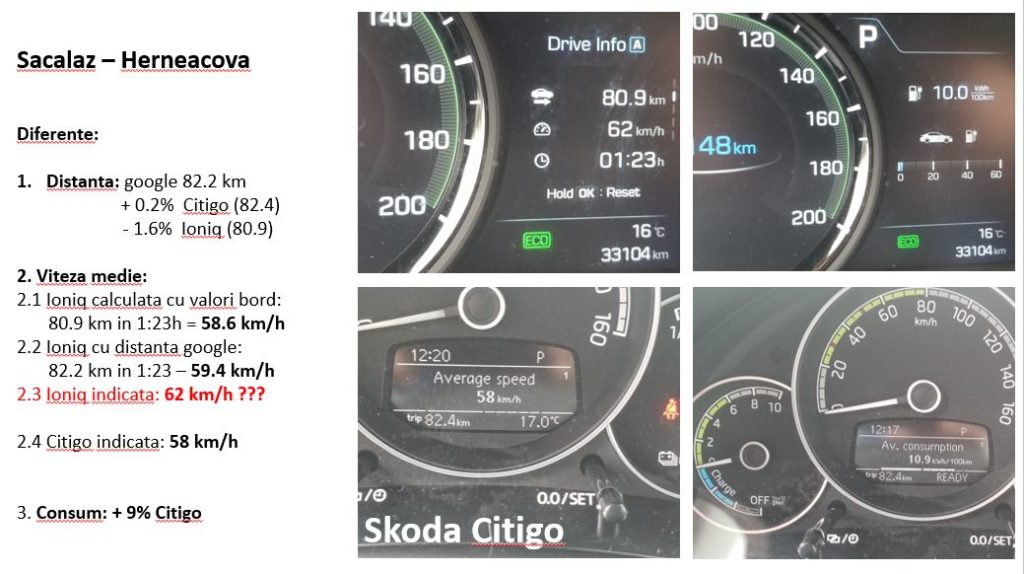 In plus la prima plimbare paralela, Citigo a avut doi ocupanti, iar Ioniq unul singur, dar cu toate acestea consumul a fost mult mai bun decat cel indicat de EVdatabase.org. E drept ca am avut parte de conditii meteo ideale pentru masinile electrice, fara sa fie nevoie de climatizare, incalzire sau alti consumatori suplimentari (dezaburire, stergatoare, lumini, etc).