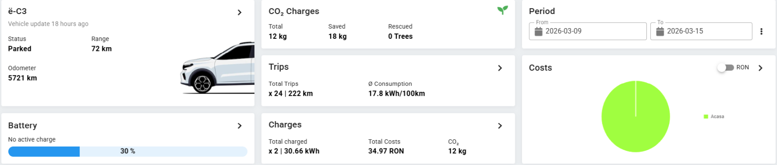 - Cost încărcare: acasă – Hidroelectrica 21.75 + 4.70 + 4.40 kWh x 1.14 RON = 35.16 RON