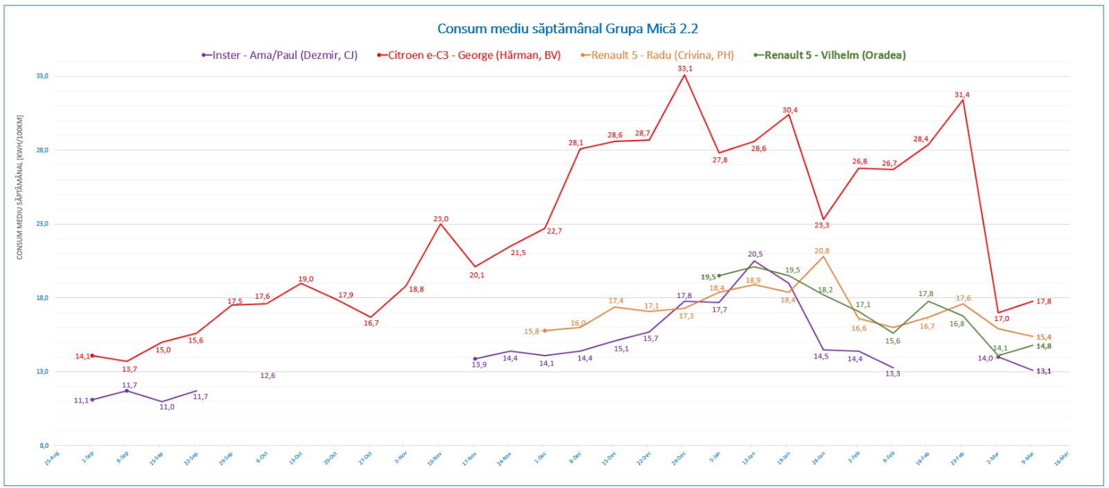 - Consum mediu al perioadei: 15.4 kWh/100 km