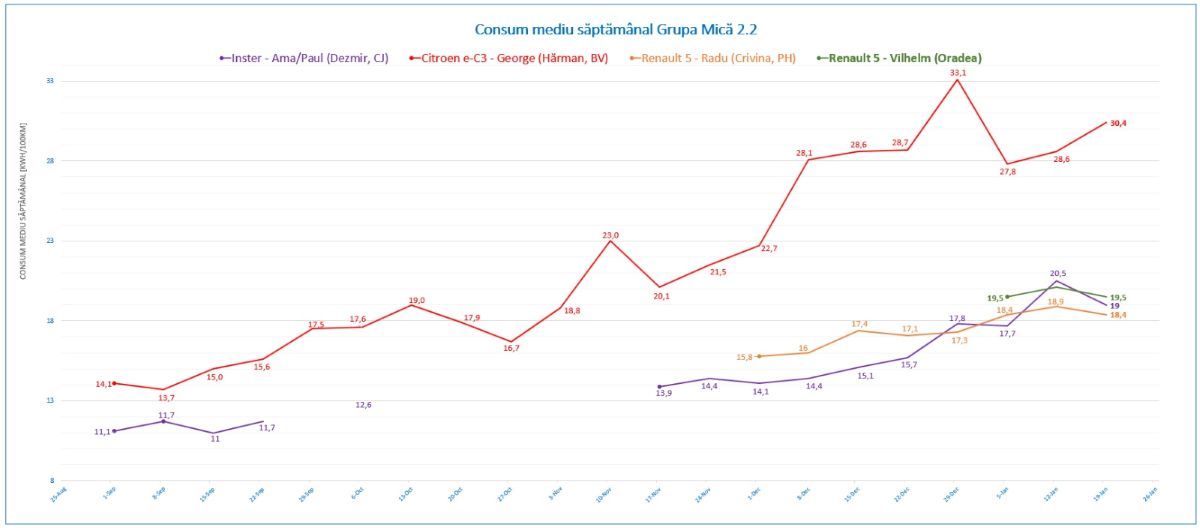 Săptămâna în cauză am avut nevoie de maşinuță doar pentru o zi pentru deplasare la birou, consumul a scăzut uşor față de săptămâna anterioară. La naveta spre birou am fost 3 persoane în maşină, tempomat la 100 km/h şi -6 grade. Deplasările locale s-au efectuat la temperaturi mult mai blânde, undeva între 3-7 grade, înregistrând şi consumuri de 12.4 kWh/100km pe deplasări de 8-10 km. Abia aştept primăvara să cobor sub 10 kWh/100km.