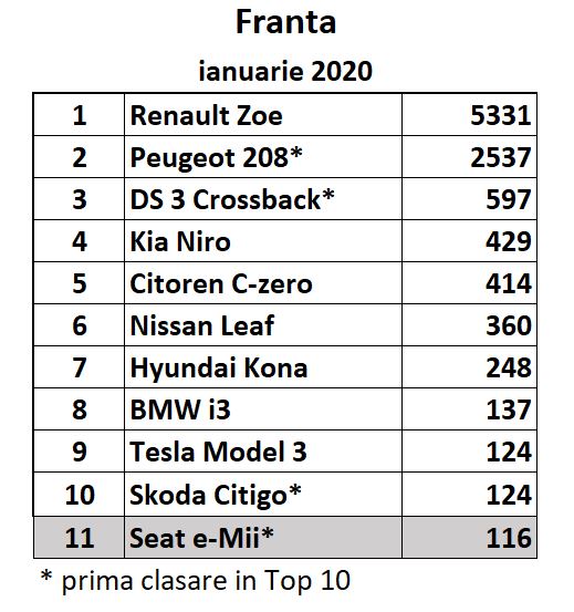 Alte doua premiere remarcabile in topul francez sunt Skoda Citigo si Seat e-Mii aflate la prima clasare pe o piata majora.