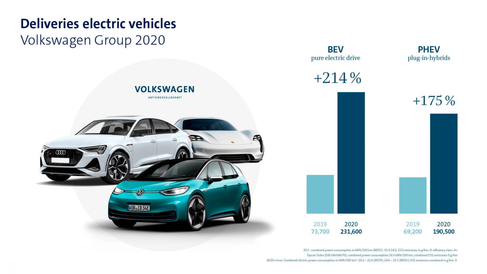 Pe fondul scăderii vânzărilor în general și a creșterii categoriei BEV + PHEV, modelele 100% electrice și hibrizii plug-in au făcut un salt în ponderea vânzărilor de vehicule noi ale grupului VW, de la 1.3% in 2019 la 4.54% in 2020.