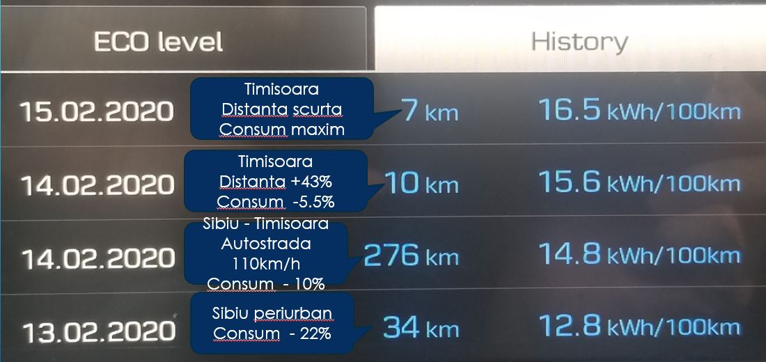In exemplul ales mai sus, cel mai bun consum zilnic a fost inregistrat 13.02 la Sibiu, in conditiile ideale pentru Hyundai Ioniq electric, cel al navetei periurbane, simulate pe traseul test drive-urilor din cadrul proiectului Electromobilitate: Turnisor, Poplaca, Orlat, Turnisor.