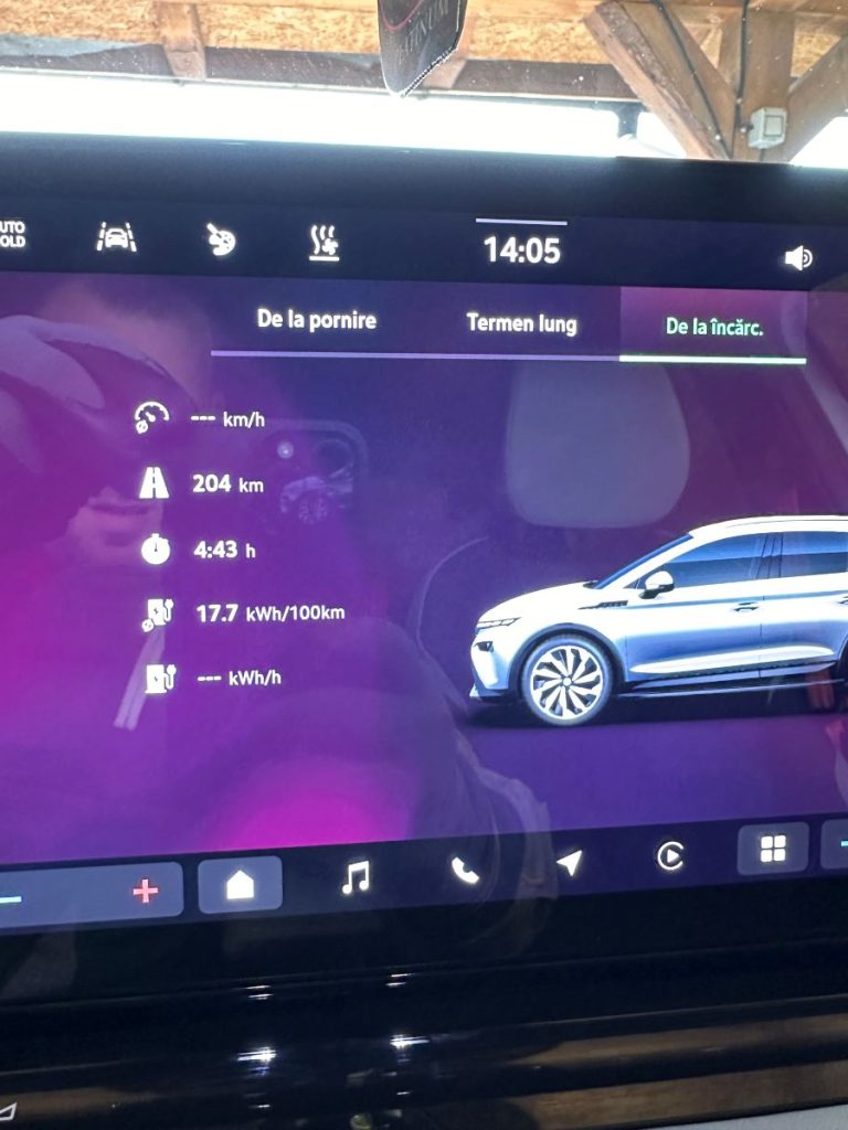 Exemplu : Am avut 90% SOC la 1065 km și am băgat-o cu 28% la încărcat la 1228 km -> deci 160-ish de km parcurși, mașina făcând strict drumuri de fâțâială între 1 km si 10 km per trip, în și pe lângă oraș.