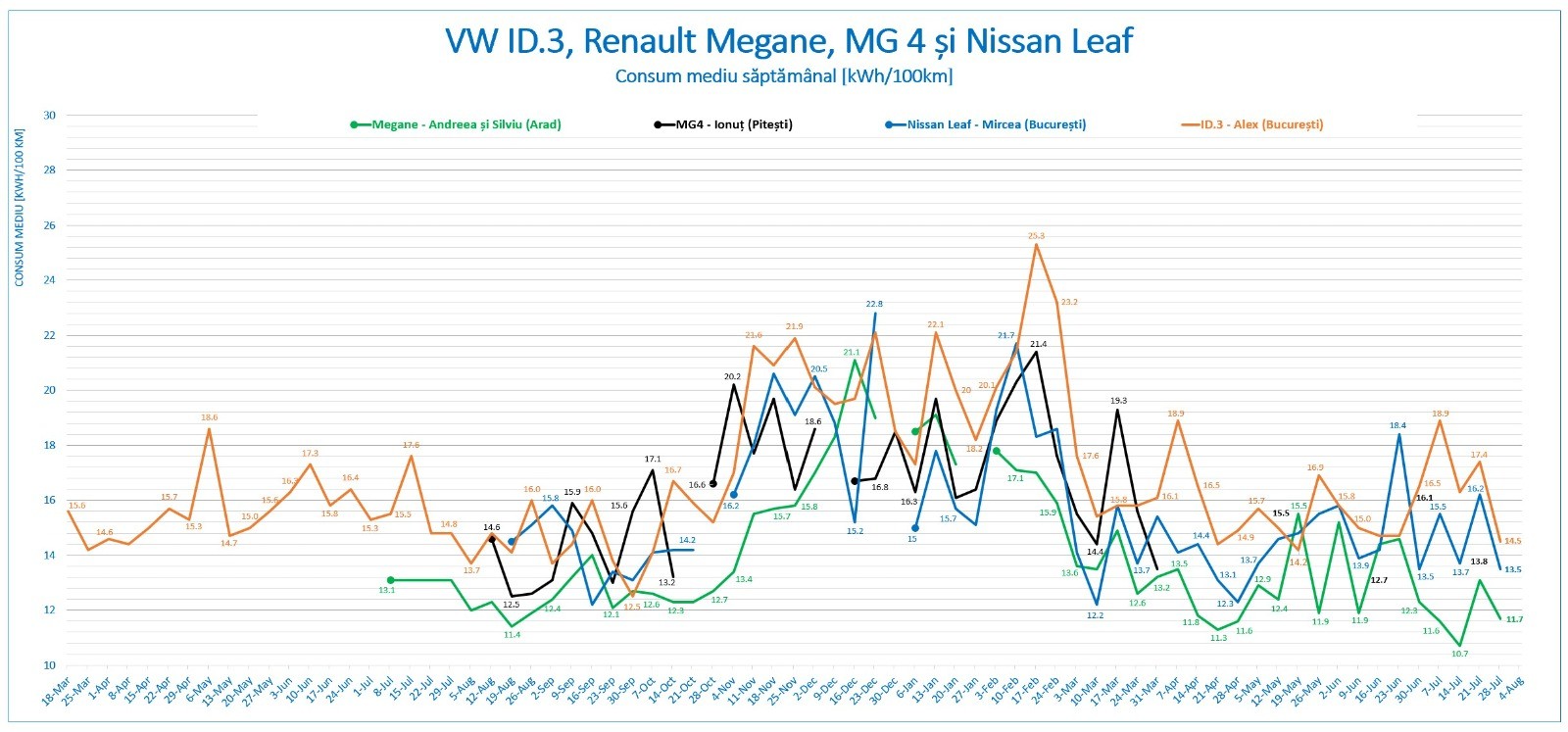 Suntem posesori de mașini electrice din 2020, dar tot suntem surprinși că întreg graficul de consum săptămânal s-a aliniat in această vară ca într-un dans sincron la nivelul Grupei Mijlocii. Este o echipă variată, formată din patru modele provenind de la producători diferiți: VW ID.3, Renault Megane, Nissan Leaf și MG4 și circulăm în condiții foarte diferite, preponderent în zona Bucuresti (2), Arad și Pitesti. Nu în ultimul rând, și ”graba” fiecăruia este diferită.