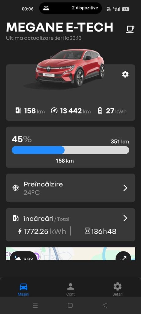 - Cost încărcări : 25,8 kWh total, din care 2,4 kWh din rețea. Estimativ: 1,8 RON (0,75 RON/ kWh). Corespunzând a 0,85 RON/100 km