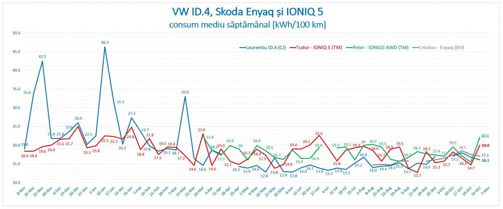 Temperaturile în scădere vor modifica clar valorile consumurilor afișate în bord, mai ales pe distanțe scurte, „20+” urmând să apară din ce în ce mai des, mai ales pentru noi cei din Grupa Mare a proiectului Electromobilitate.