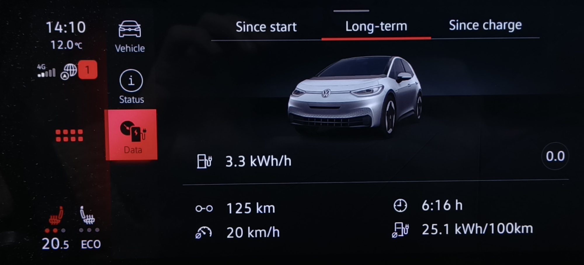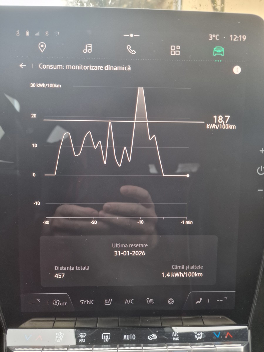 - consum mediu: 17 kWh/100km – foarte mare pe frig pe autostradă (la 120km/h) față de valorile cu care eram obișnuit (24 kWh/100km) și foarte ok pe drumuri de munte (Brașov – Rucăr – Câmpulung – Pitești a avut 12 kWh/100km),