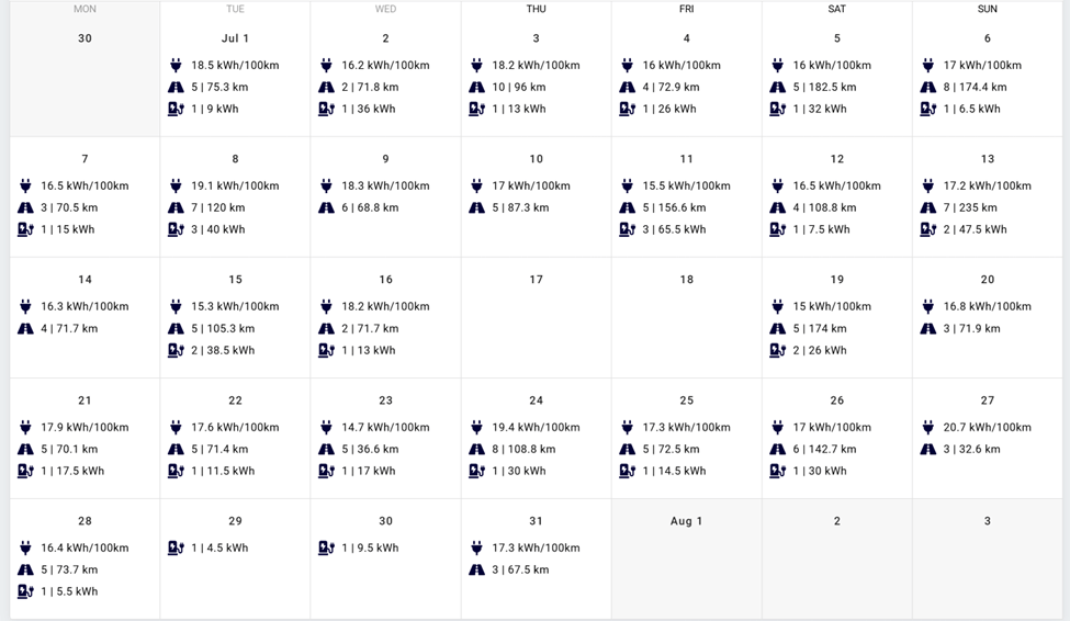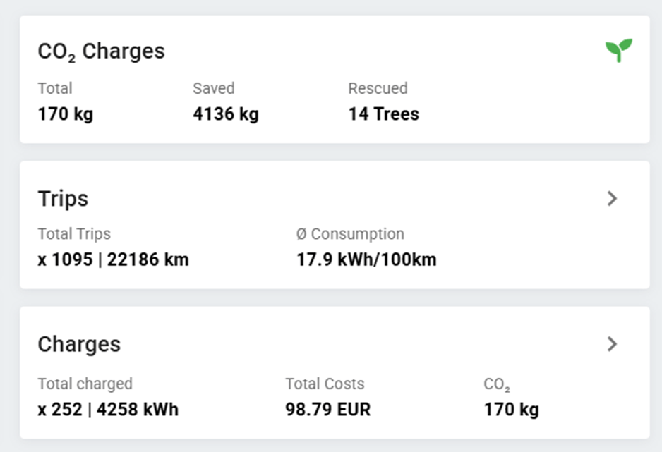 Informațiile sunt însă extrem de puține: odometru, trasee pentru care ai ora de plecare si sosire, viteză medie, timp și distanță dar nu consum și SoC.