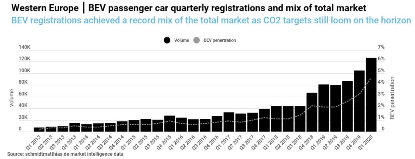 Dincolo de repetarea obsesiva a unor adversari convinsi ai electromobilitatii ca „in Europa clientii nu sunt intersati de automobile electrice„, statisticile arata an de an o crestere a inmatricularilor, iar primul trimestru din 2020, a depasit toate recordurile anterioare.