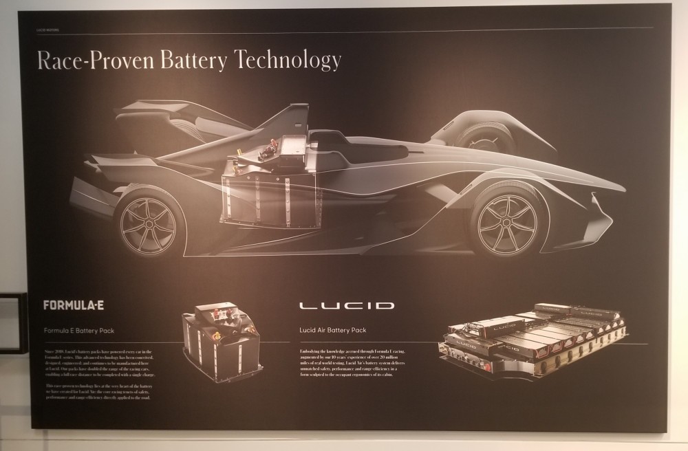 Alături de motor, sunt expuse elementele din care sunt compuși acumulatorii. Spre deosebire de concurență și practica generală in industrie, acumulatorul utilizat de Lucid nu este un ansamblu aproximativ dreptunghiular, cu înălțime constanta, instalat sub podea, ci poate fi modelat în funcție de nevoile de spațiu interior, prin suprapunerea elementelor pe înălțime.