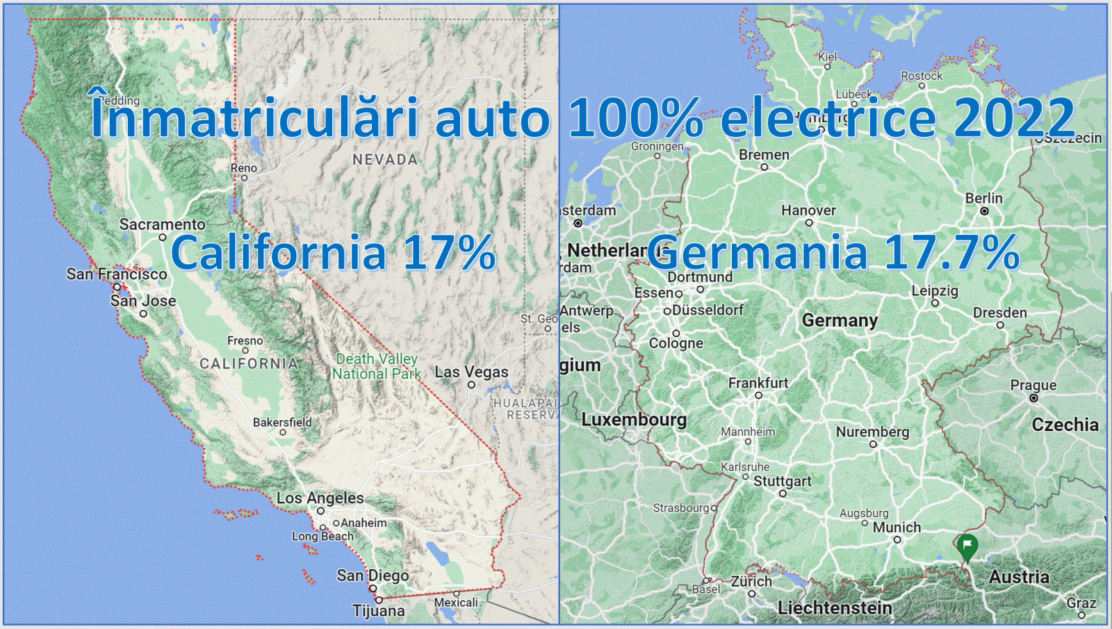 Statisticile înmatriculărilor de automobile electrice din 2022 în California și Germania, reflectă tocmai această diferențiere a structurii economice și percepție a electrificării transportului rutier ca: