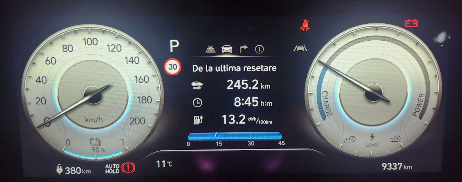 La întoarcere am venit pe M3 cu 100 km/h şi media a ieşit la 12.3 kWh/100 km, vânt din spate, condiții ideale.