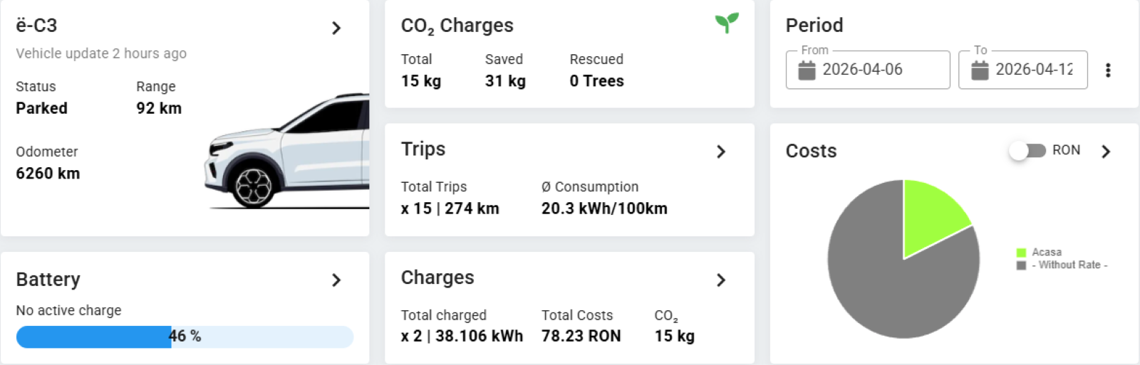 - la e-charge ~26 kWh cu ~65 RON.