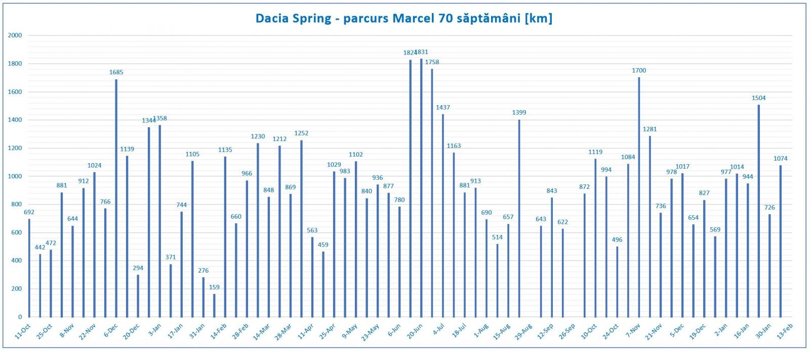 Statistica parcursului indică o medie de 1000 km/săptămână, dar graficul celor 70 săptămâni arată valori ce depășesc 1800 km/săptămână și altele, e drept foarte puține, de repaos total. Consumul mediu după primii 70.000 km este 13.7 kWh/100km cu variații semnificative între sezonul cald și cel rece.